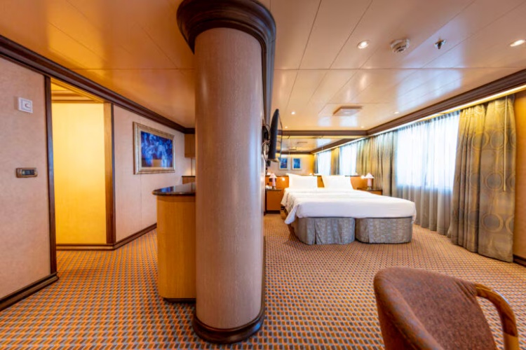 超大阳台?检查。我们的加长阳台豪华套房为您在船上的住宿提供宽敞的休憩之所,内外空间均额外增加。此外,客房还提供套房独有的所有礼遇,包括步入式更衣区和泡澡浴缸。