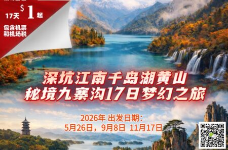 2026-05-26 中国 ○ 17天 深坑江南·千岛湖黄山·秘境九寨沟梦幻之旅(澳洲出发包机票)