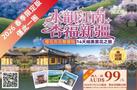中国 ○ 14天13晚 水韻江南·杏福新疆 絕美賞花之旅 (2026 春季限定版)商品編號:07CN14-PV/20260107行程時間:14天13晚出發日期:2026年3月31日抵達城市:上海 SHA離開城市:烏魯木齊 URC服務語言:中文导游 -