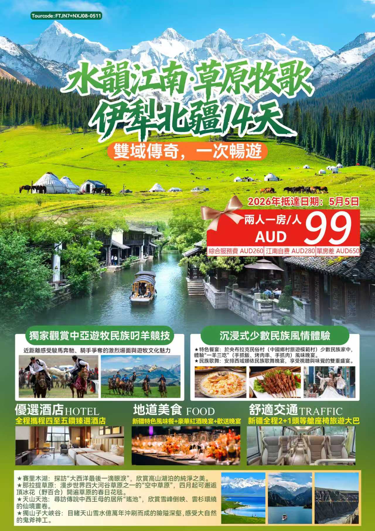 - 特色美食: 全程新疆特色风味餐+豪华红酒晚宴+欢送晚宴