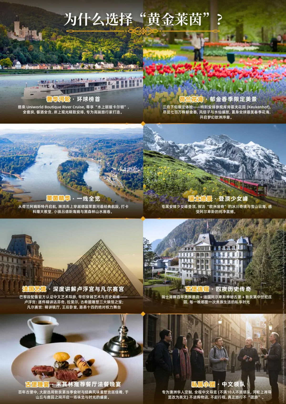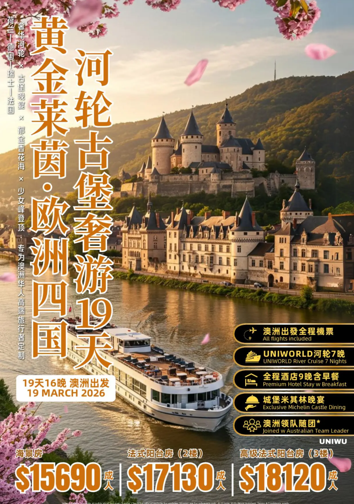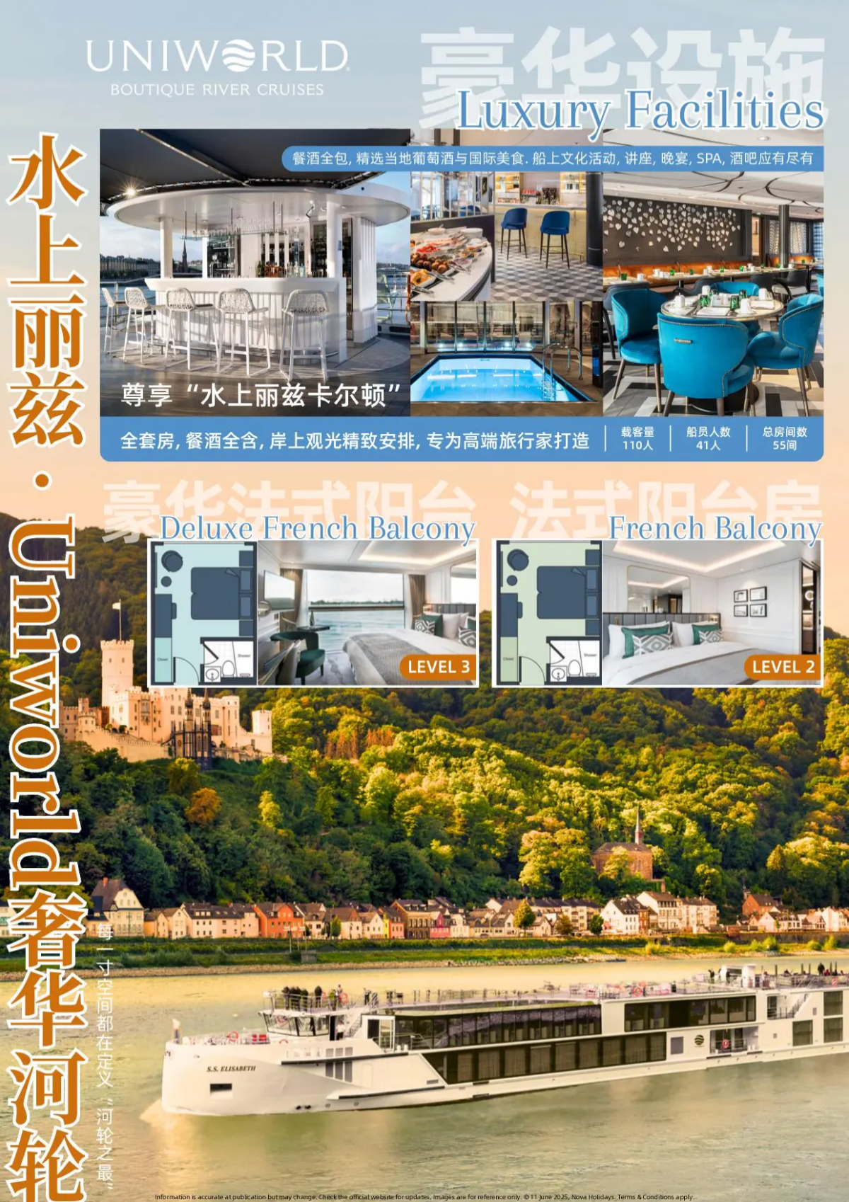 - 奢華河輪 · 環球榜首: 搭乘 Uniworld Boutique River Cruise,尊享“水上麗茲卡爾頓”,全套房、餐酒全含、岸上觀光精致安排,專為高端旅行家打造。
