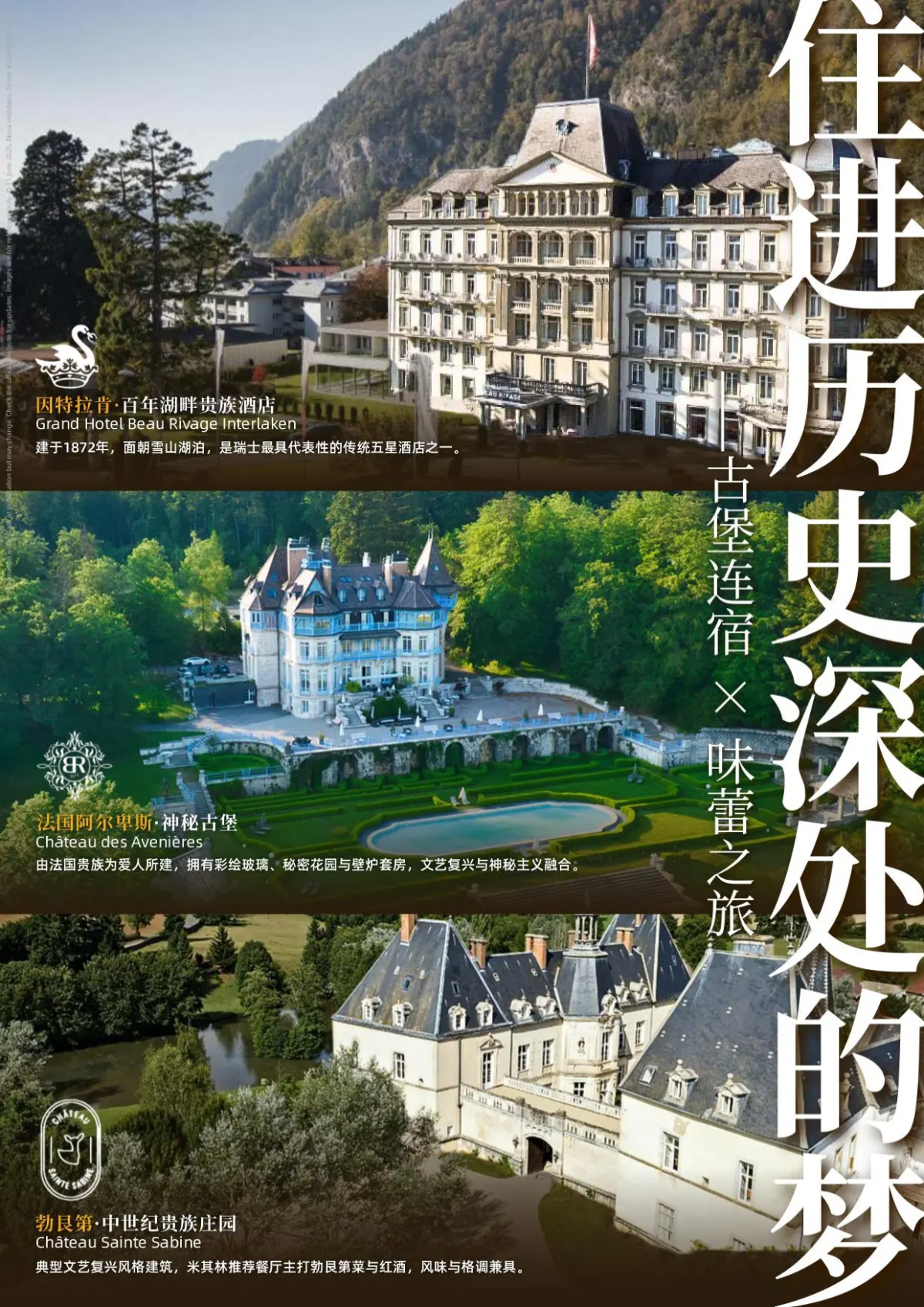 - 堡连宿 · 四夜历史传奇: 瑞士湖畔百年贵族酒店+法国阿尔卑斯神秘古堡+勃艮第中世纪庄园,每一晚都是一次贵族生活的私享时光。