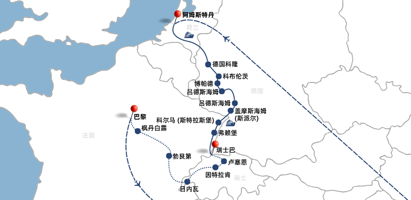 - 萊茵精華 · 一線全覽: 從荷蘭阿姆斯特丹啟航,溯流而上穿越德國萊茵河最經典航段,打卡科隆大教堂、小鎮呂德斯海姆與黑森林山水畫卷。