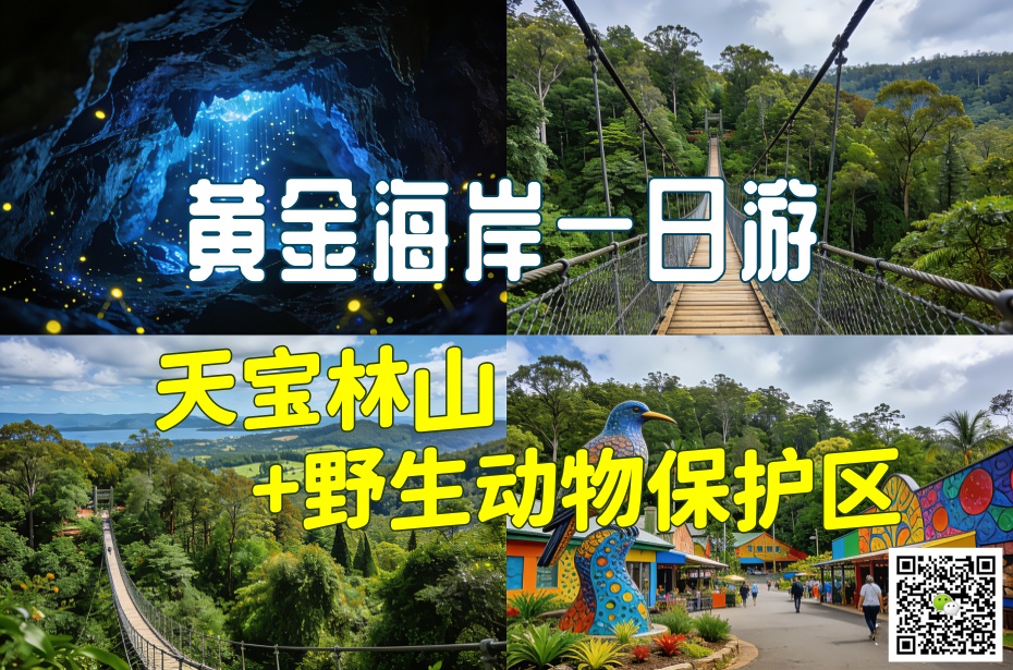 宝林山 Mt Tamborine: 位于黄金海岸市区西北约45公里,是昆士兰州的“瑰宝秘境”,以雨林、瀑布、蓝光萤火虫洞及空中步道闻名,是一日游和自然探索的理想目的地山上覆盖热带雨林,远眺黄金海岸和连绵海岸线,环境清幽,被誉为金沙碧海背后的绿洲。蓝光萤火虫洞(Glow Worm): 柯蒂斯瀑布附近洞穴内观赏夜间蓝光萤火虫,提供高亮过滤LED手电筒保护野生生物,观赏高峰期为每年11月至12月中旬,但雨天或湿度高时蓝光虫活跃度更高。雨林空中步道(Skywalk): 步道全程由钢筋架设,高约30米、长度约1.5公里,沿途可俯瞰私人热带雨林,体验与自然零距离接触。