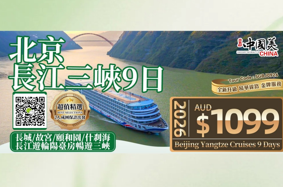 – 白帝城 CNY295、三峽人家 CNY295、升船機 CNY295、 豐都鬼城或武陵山大裂谷 CNY295 -