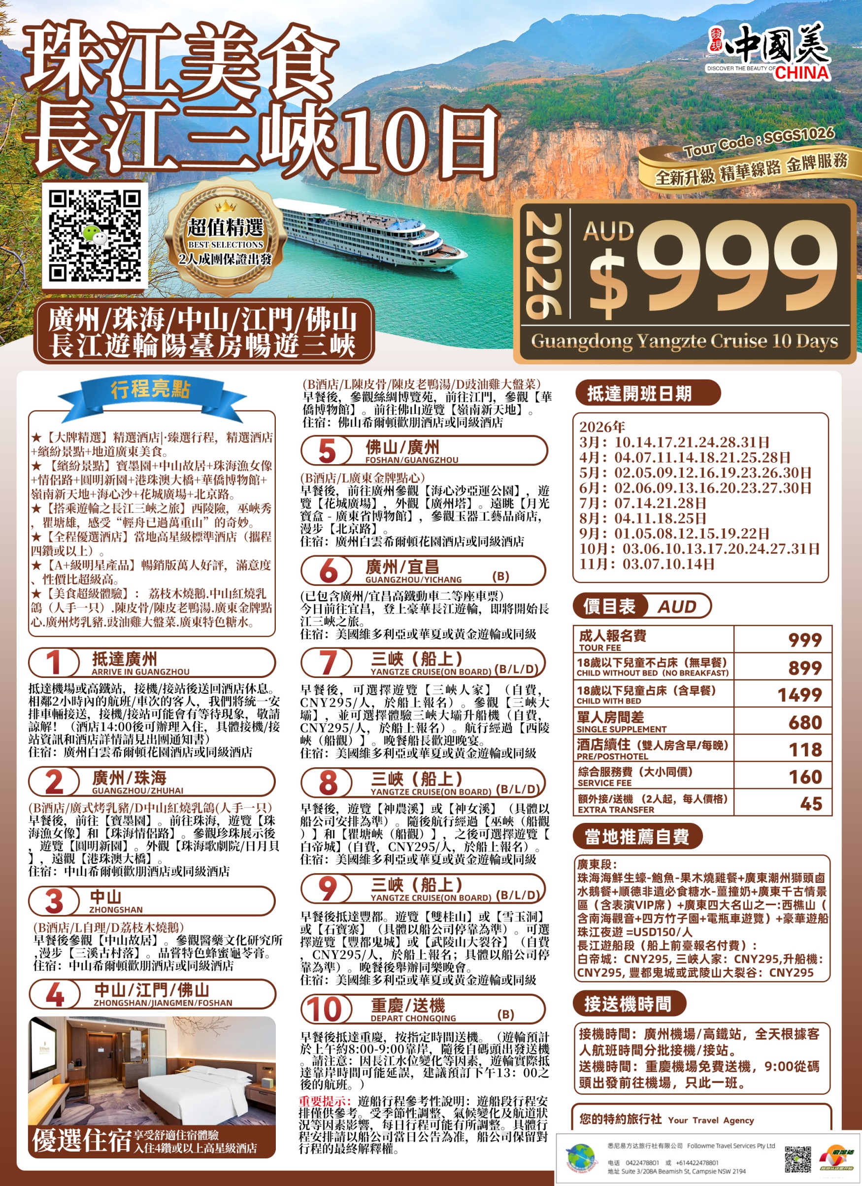 - 抵达城市和接机资讯: 廣州機場/高鐵站,全天根據客人航班時間分批接機/接站。