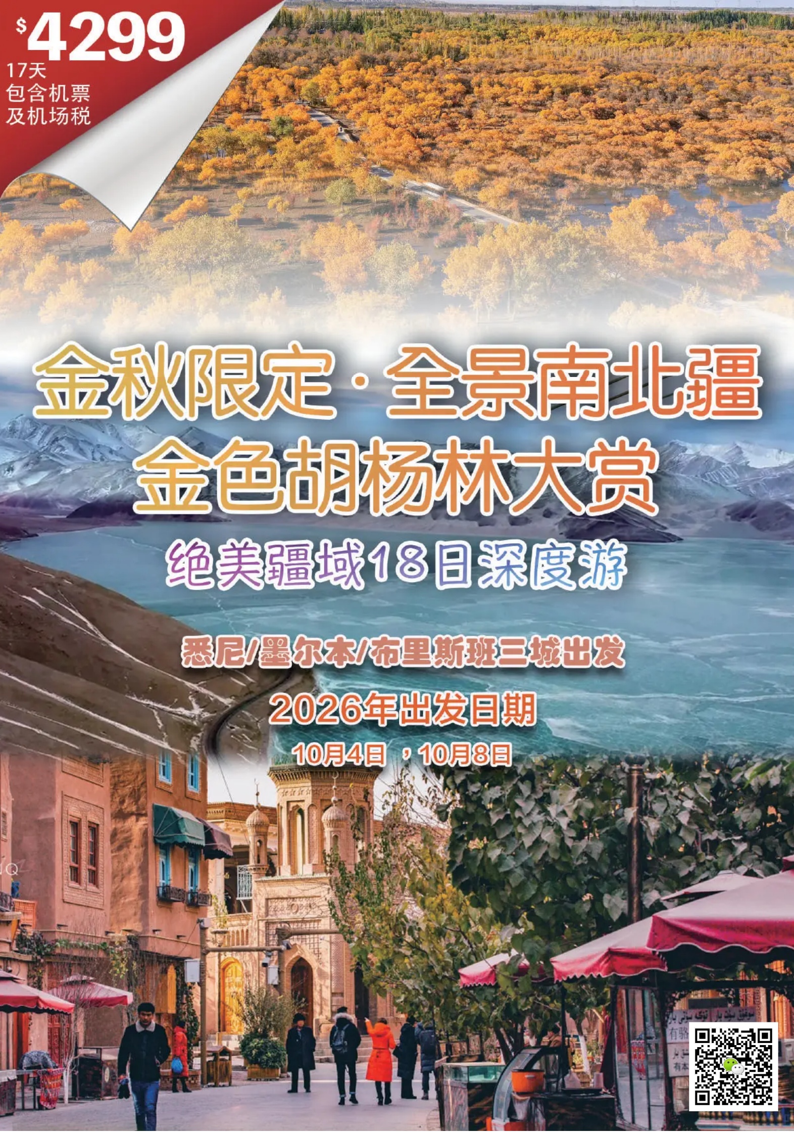 - 澳洲-中国来回经济舱机票、伊宁——库车国内段经济舱机票、行程中注明的4-5星酒店住宿和早餐、行程所列景點首道門票、行程中标明的餐食和特色餐食,安排2+1巴士或同级2+2巴士、优秀中文导游
