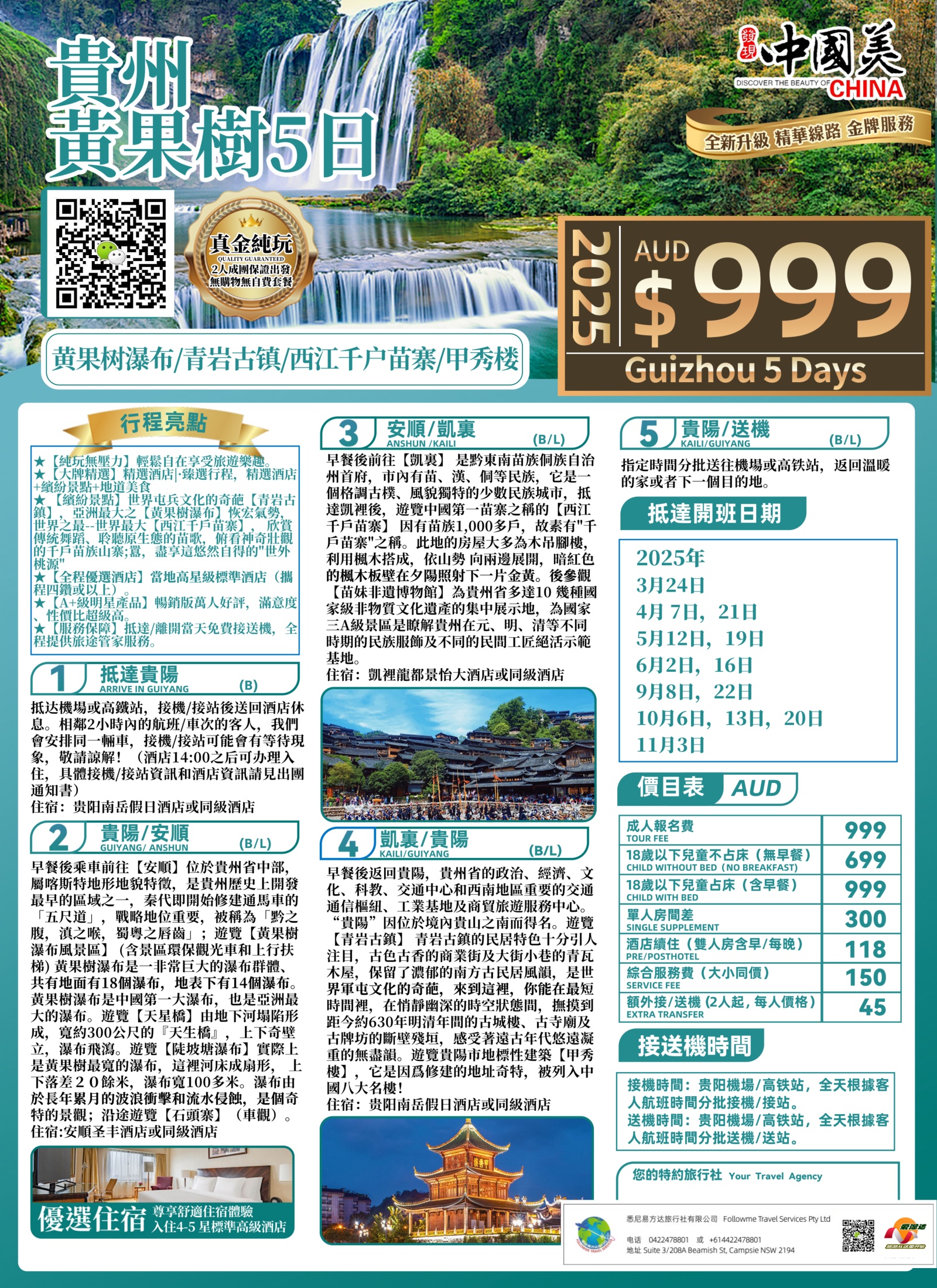 - 抵达城市和接机资讯:贵阳機場/高铁站,全天根據客人航班時間分批接機/接站。