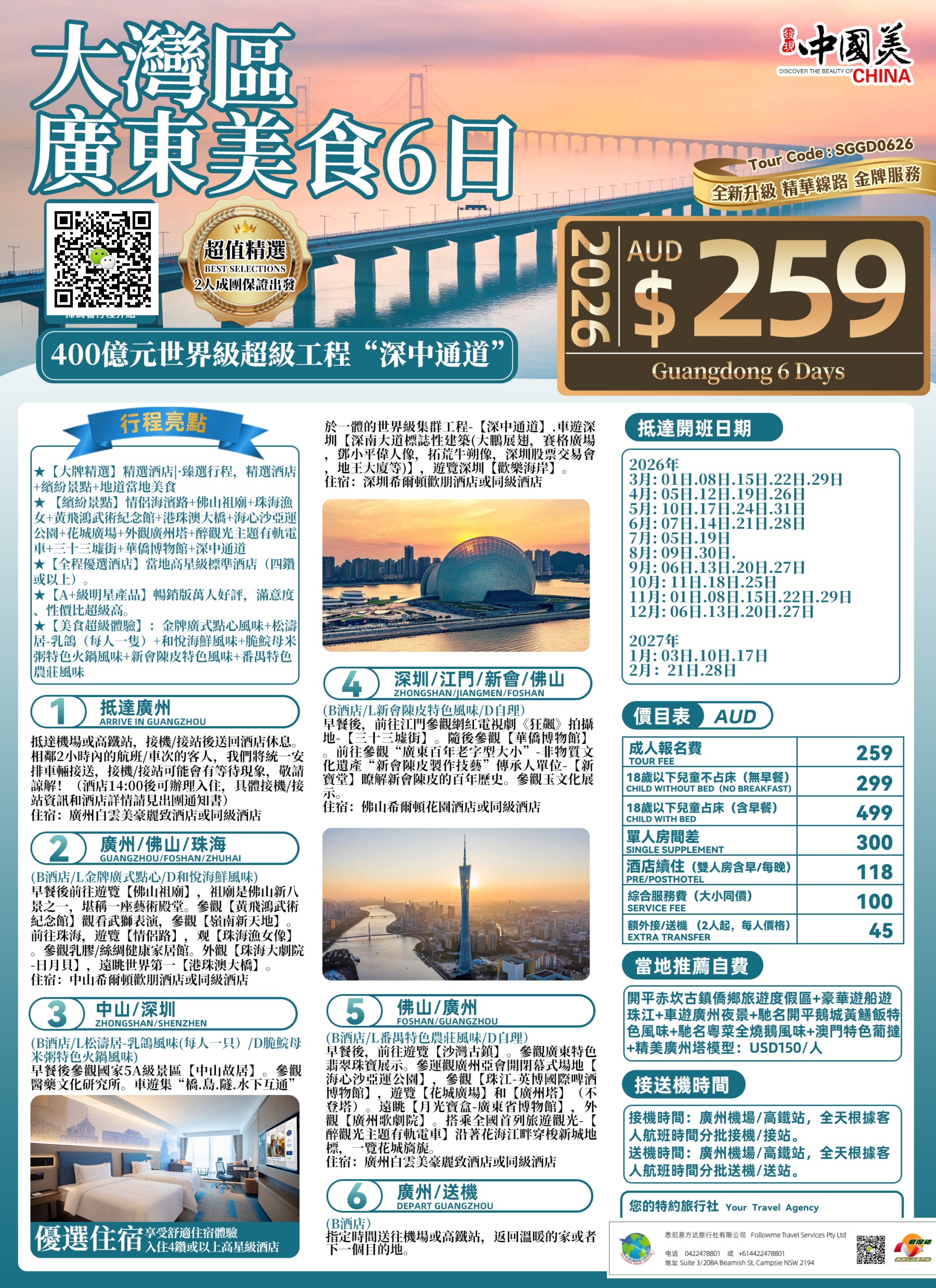 - 当地推荐景点 (隆重推荐,自费参加) : 開平赤坎古鎮僑鄉旅遊度假區+豪華遊船遊珠江+車遊廣州夜景+馳名開平鵝城黃鱔飯特色風味+馳名粤菜全燒鵝風味+澳門特色葡撻+精美廣州塔模型=USD150/人