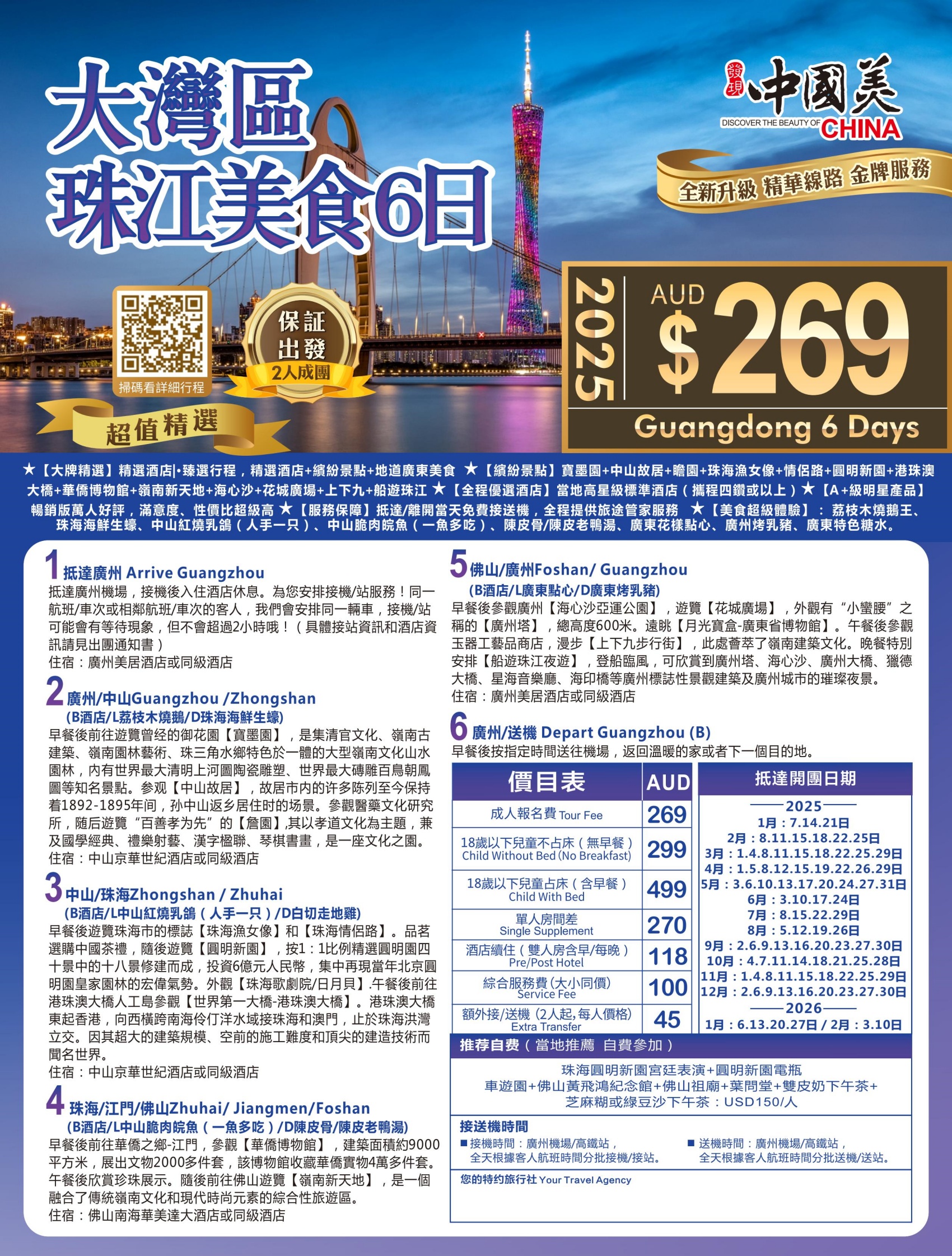 - 【美食超級體驗】荔枝木燒鵝王、珠海海鮮生蠔、中山紅燒乳鴿(人手一只)、中山脆肉皖魚(一魚多吃)、陳皮骨/陳皮老鴨湯、廣東花樣點心、廣州烤乳豬、廣東特色糖水