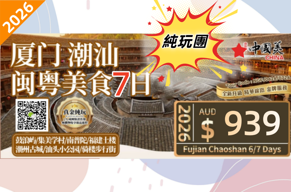 早餐后,游览【福建土楼】,有“圆楼之王”美誉的承启楼和历史悠久的五云楼,世泽楼以及有“博士楼”之称的侨福楼等土楼,众土楼和大自然融为一体,呈现一派美妙无比的田园风光。午餐后前往汕头,游览【老妈宫】【小公园】【骑楼步行街】这片骑楼群是十八世纪末十九世纪初开埠的32个城市里,目前保存比较完好的一片骑楼建筑群。