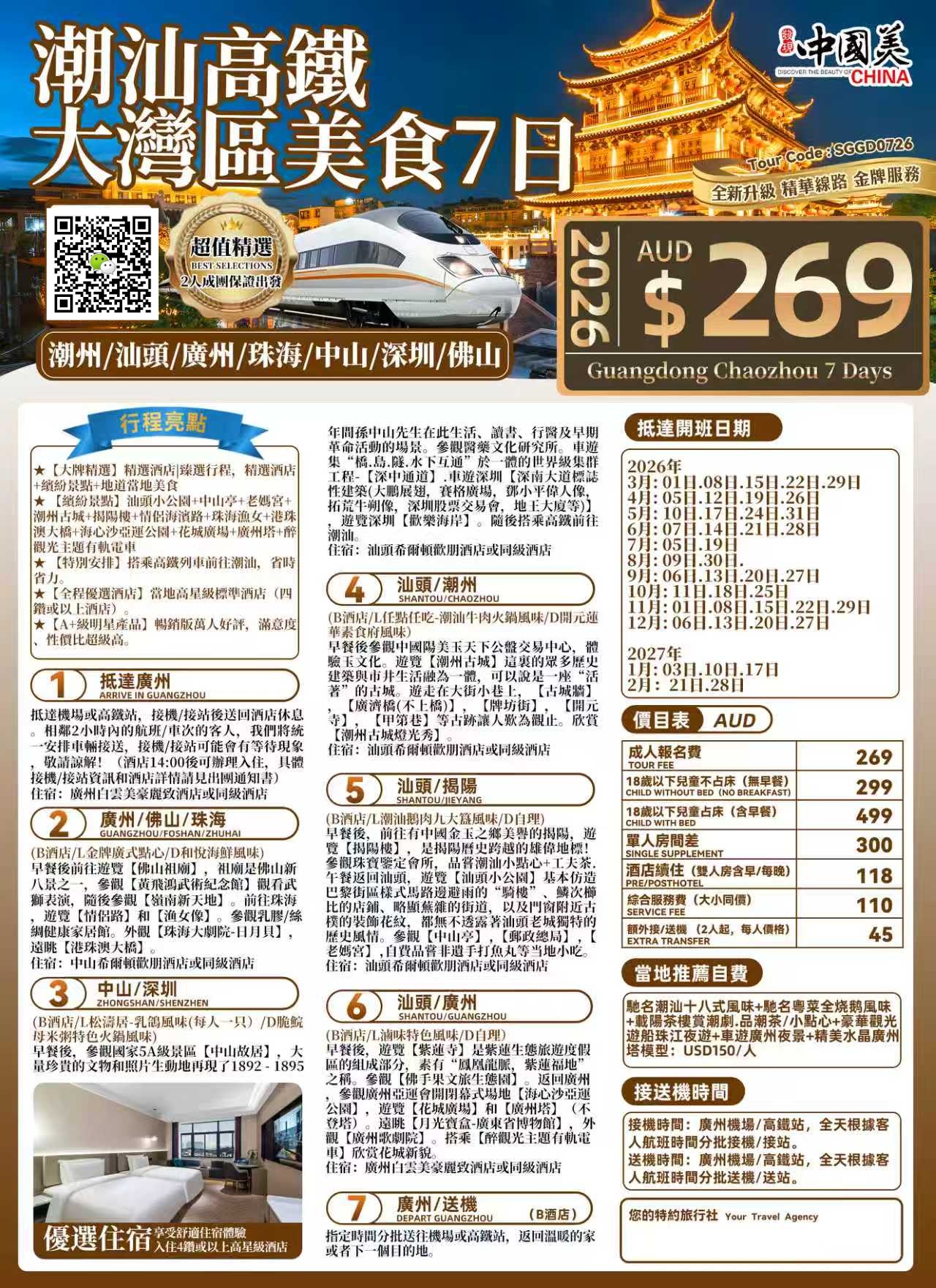 - 当地推荐景点 (隆重推荐,自费参加): 馳名潮汕十八式風味+馳名粵菜全烧鹅風味+載陽茶樓賞潮劇.品潮茶/小點心+豪華觀光遊船珠江夜遊+車遊廣州夜景+精美水晶廣州塔模型=USD150/人