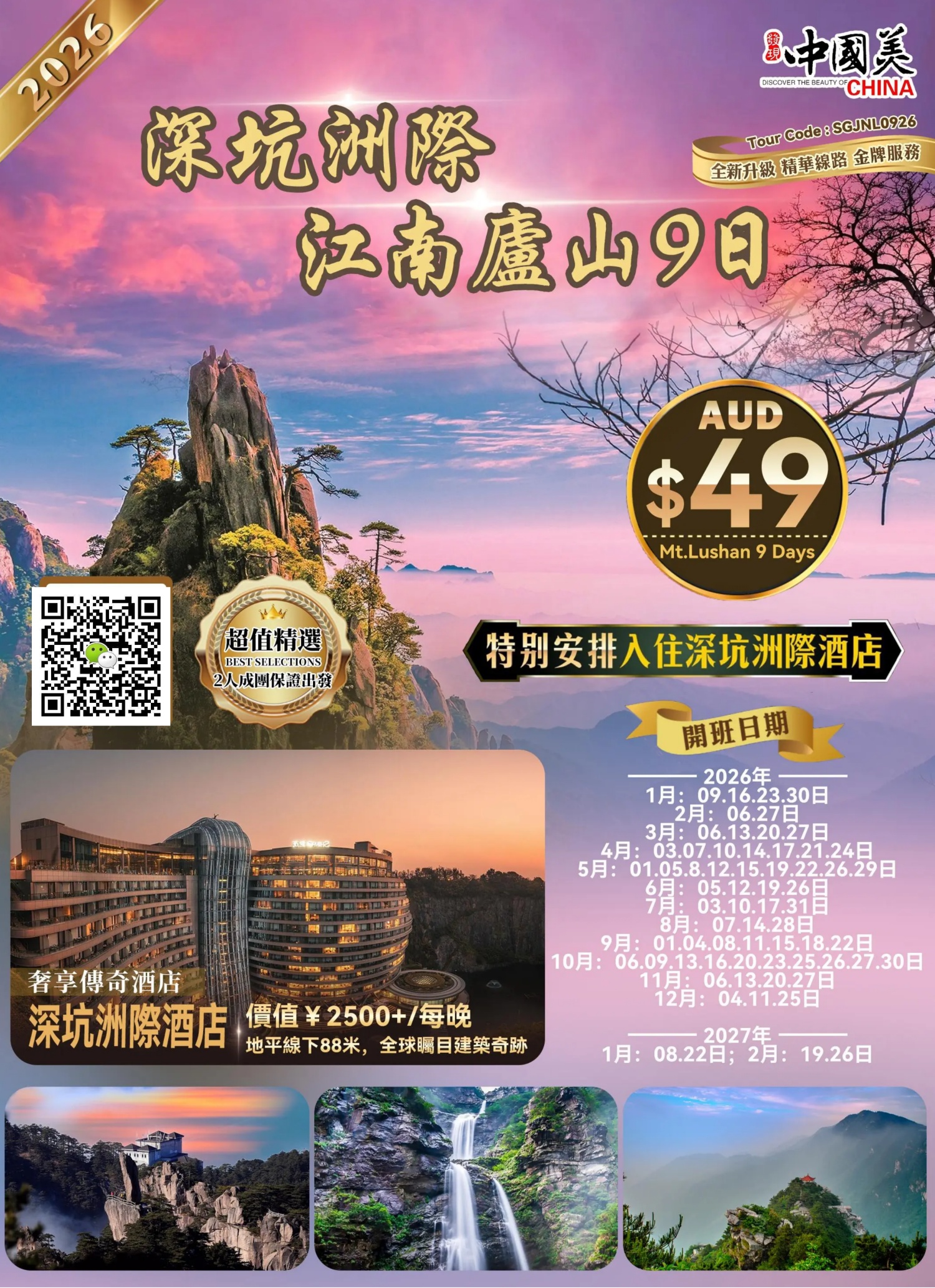 或或參加當地推薦自費節目套餐前往遊覽【盧山風景區(含观光车)+1個午餐= USD120/人】:遊覽如琴湖、花径、锦绣谷、天桥、仙人洞、御碑亭、美盧别墅、含鄱口等景区。
