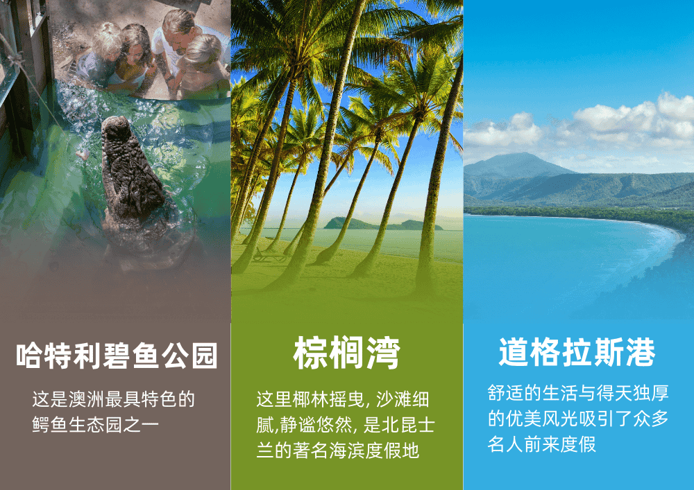 09:00-09:30中文司机兼导游将在凯恩斯酒店或机场迎接贵宾,随后沿着风景如画的库克公路(Captain Cook Highway)出发,前往热带度假胜地棕榈湾(Palm Cove)。这里椰林摇曳,沙滩细腻,静谧悠然,是北昆士兰的著名海滨度假地。随后抵达道格拉斯港 (Port Douglas),导游将带领游览海滨码头、观景台、“四哩海滩”及商业街,让贵宾感受小镇的独特魅力。午餐可在当地自由选择餐厅(自费),品尝澳洲特色美食。午后前往著名的哈特利鳄鱼园 (Hartley’s Crocodile Adventures),这是澳洲最具特色的鳄鱼生态园之一。贵宾可与考拉、袋鼠、鹤鸵等可爱动物互动,并乘坐鳄鱼观赏船,在专业讲解员的带领下,了解鳄鱼的自然栖息地和捕猎技巧。此外,鳄鱼喂食表演展示了鳄鱼惊人的咬合力和捕猎能力,为游客带来震撼的观赏体验。行程结束后,导游将于下午17:00左右送贵宾返回凯恩斯酒店或机场,结束一天精彩旅程。