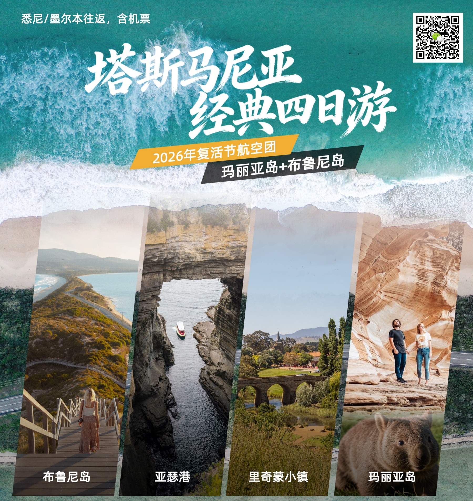 D4 亚瑟港+ 喷水洞+ 塔斯曼拱门+ 棋盘道+ 魔鬼厨房+ 送机> 悉尼或墨尔本