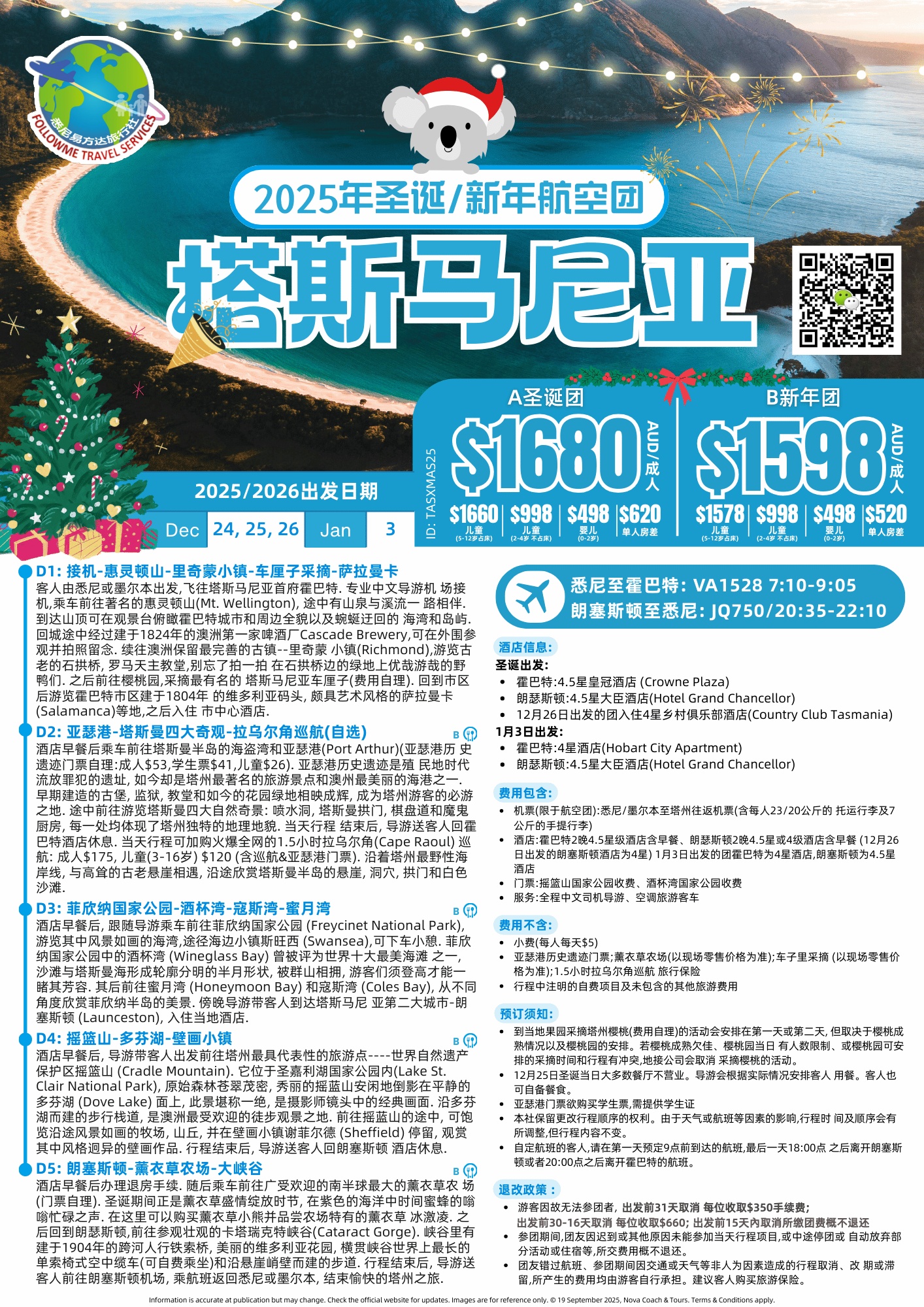 - 机票: 悉尼至塔州往返机票 (含每人23/20公斤的托运行李及7公斤的手提行李)