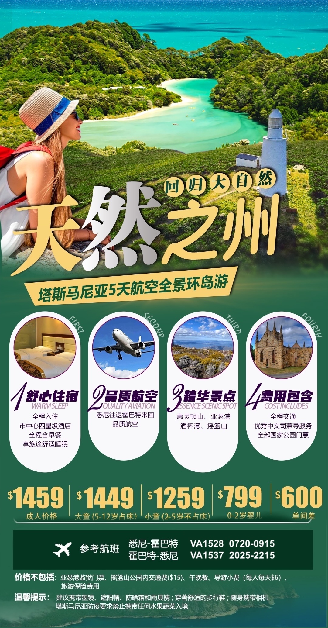 ✘费用不含:亚瑟港监狱门票、摇篮山公园内交通费($15)、午晚餐、导游小费(每人每天$6)、旅游保险费用(强烈推荐购买)