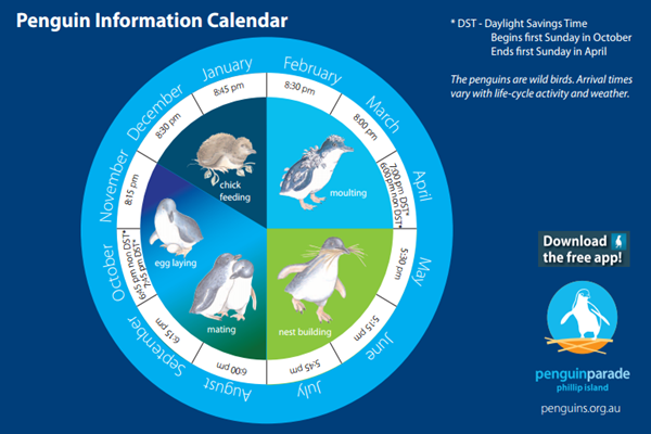 ^ 企鹅归巢: 菲利普岛上的企鹅归巢是澳大利亚最受欢迎的野生动物景观之一, 是家庭度假和回归自然的完美选择。 每当黄昏时分, 野生小企鹅们纷纷浮出海面, 摇摇晃晃地走过沙滩, 回到它们在沙丘中的洞穴里。菲利普岛是世界上最大的小企鹅聚居地之一。 小企鹅是世界上最小的企鹅种类, 也是唯一一种长期居住在澳大利亚的企鹅。