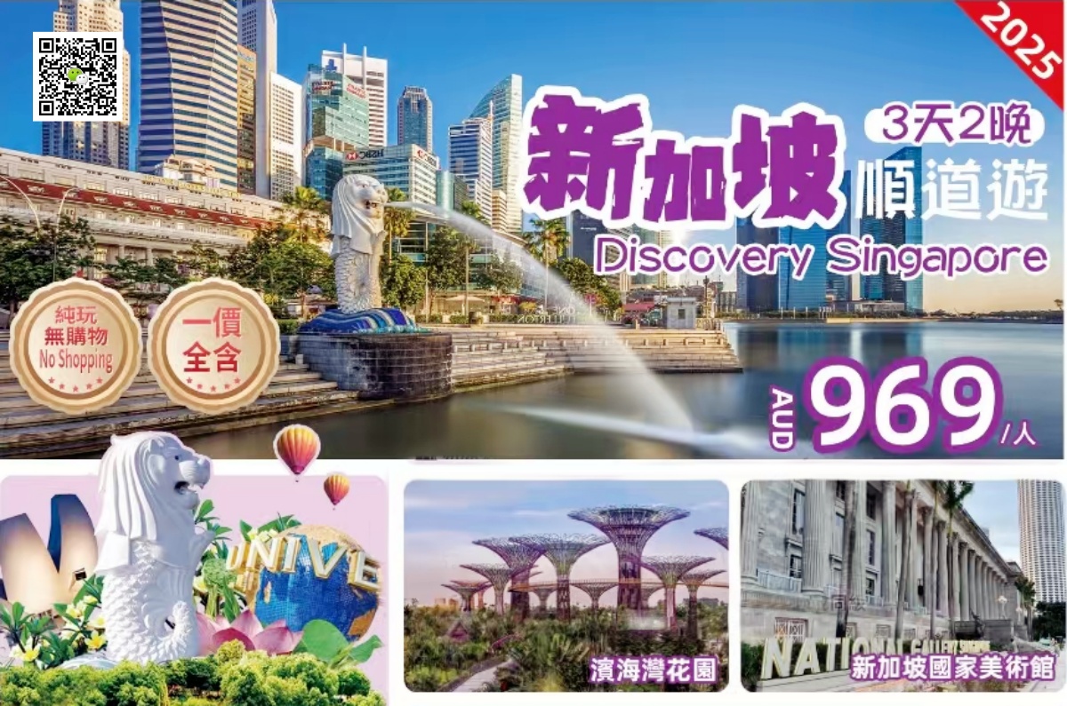 - 新加坡國家美術館(含門票)、濱海灣花围(含門票)、角屋州天赋公廟、小印度、中文導遊(或司兼導服務)
