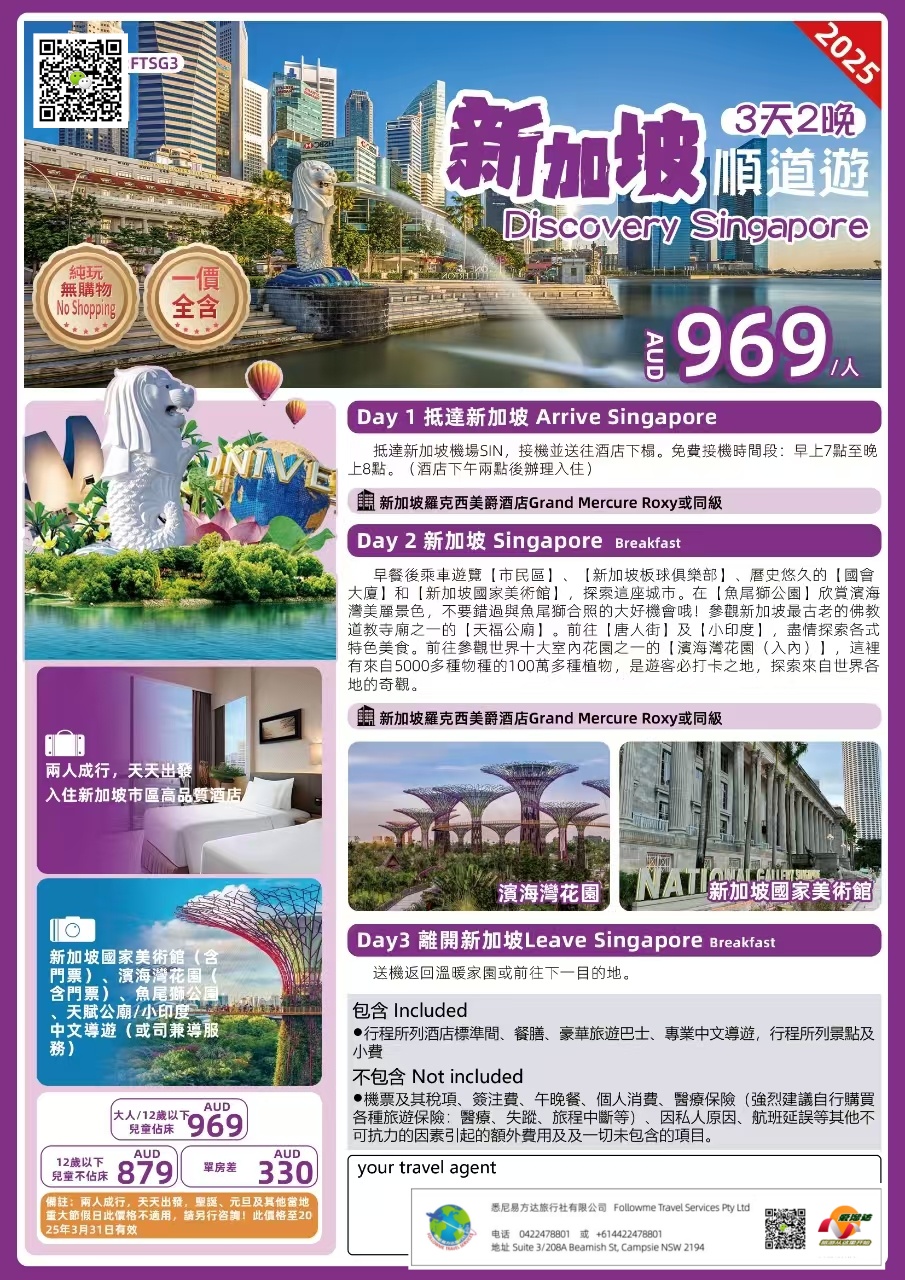 - 新加坡國家美術館(含門票)、濱海灣花围(含門票)、角屋州天赋公廟、小印度、中文導遊(或司兼導服務)