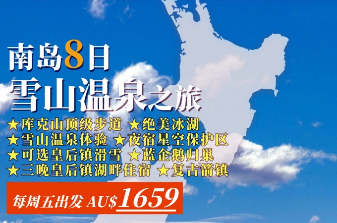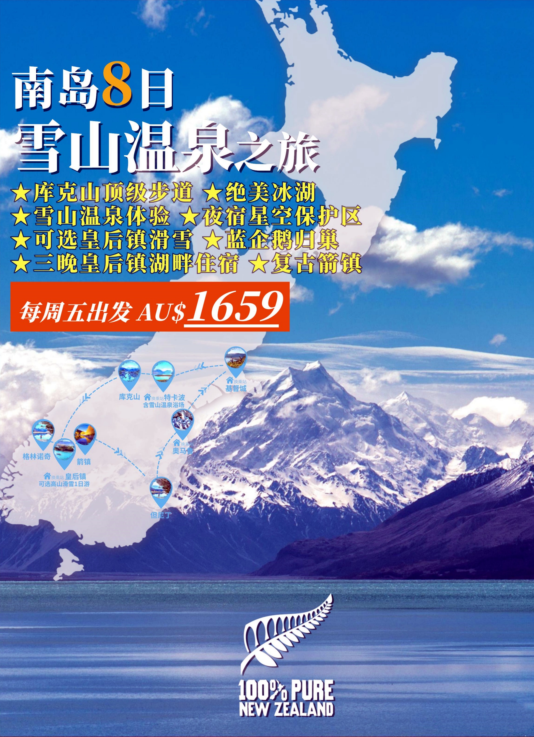 亮点::库克山国家公园、胡克雪山山谷步道、飞机登陆塔斯曼冰川川(自费)、高山三文鱼农场、克伦威尔水果小镇