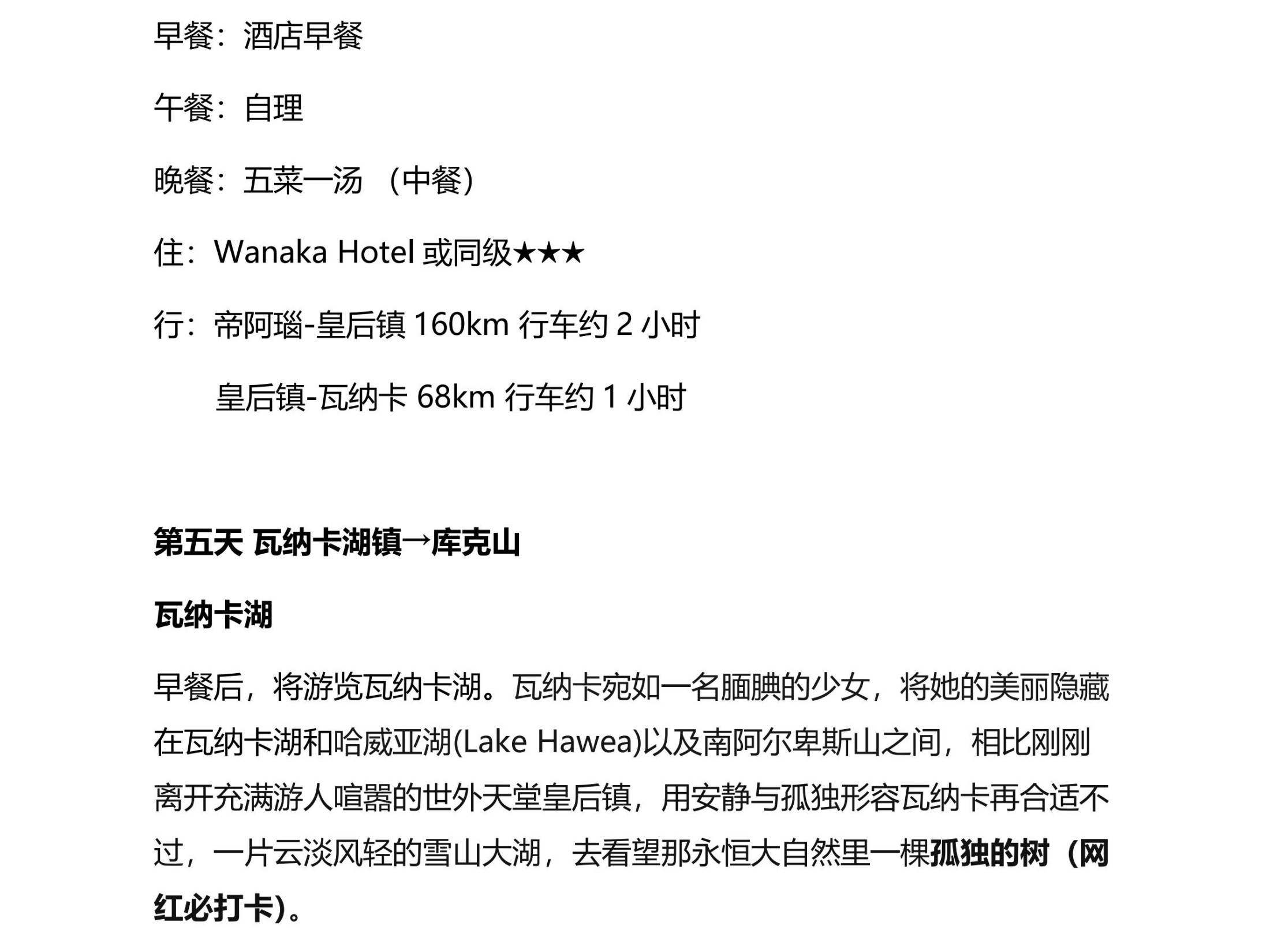 5.退团须知:●出团 36天前取消,退 100%团费;●出团 35-26日前取消,订金 NZD500/人不退;●出团 25-16日前取消,收团费的 60%;●出团前 15天内取消,收取全额团费。