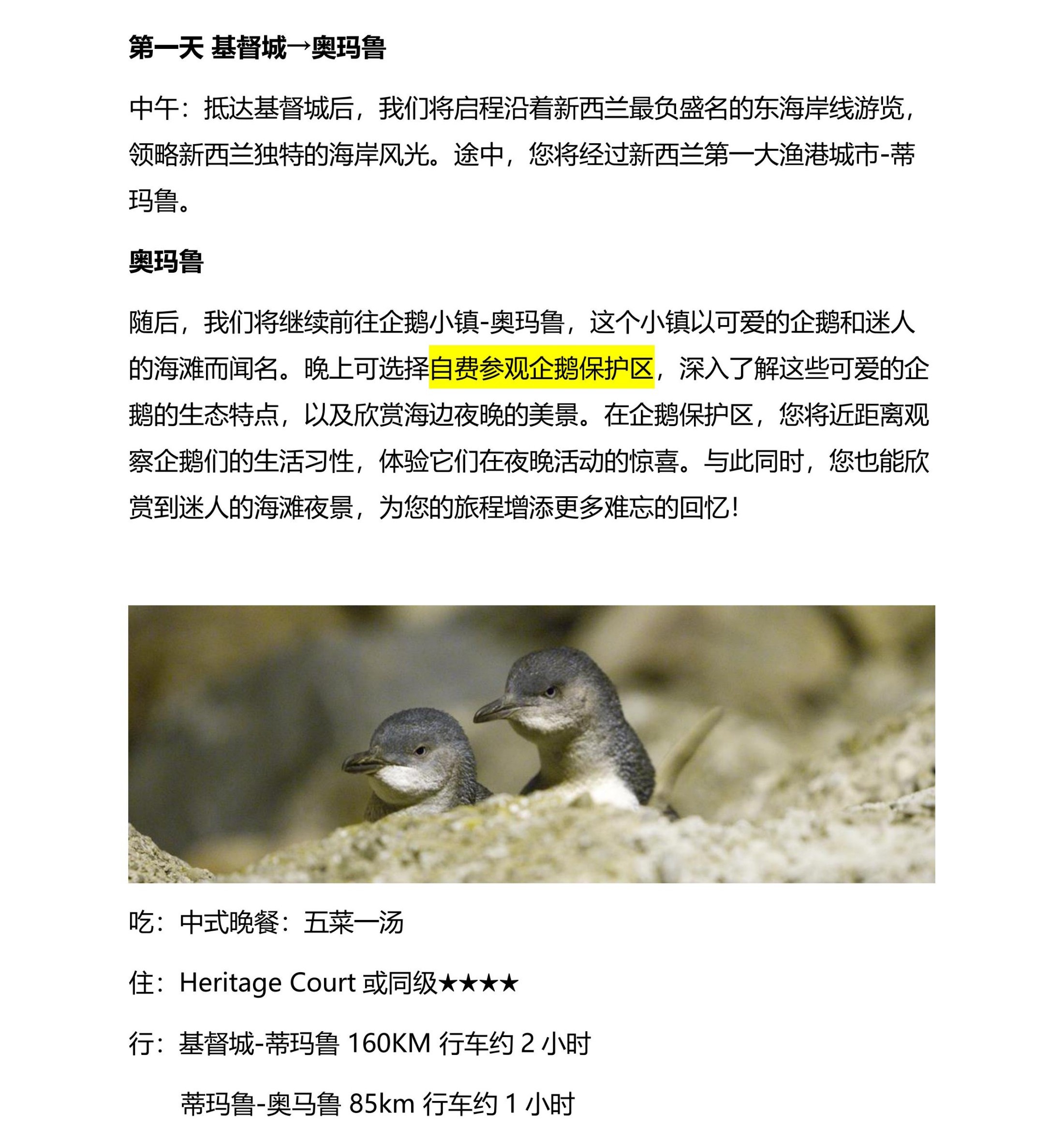 特别提醒: ( 为了避免第一天抵达的误会与不快,请务必遵守下列二项接机原则及出发规定 )。MAY-SEP,(进入了冬季),第一天行程,我们的团最晚会在纽西兰时间 16:00 离开基督城,OCT-APR,(进入了夏季),第一天行程, 我们的团最晚会在纽西兰时 16:30离开基督城,如航班晚点产生的租车追团费用,客人需自己支付。建议客人买旅游保险,以避免不必要的损失。 (尤其是担心 EK 阿联酋航空及廉价航空而迟滞,以及因带不当食品被海关扣察等延误出关的风险)