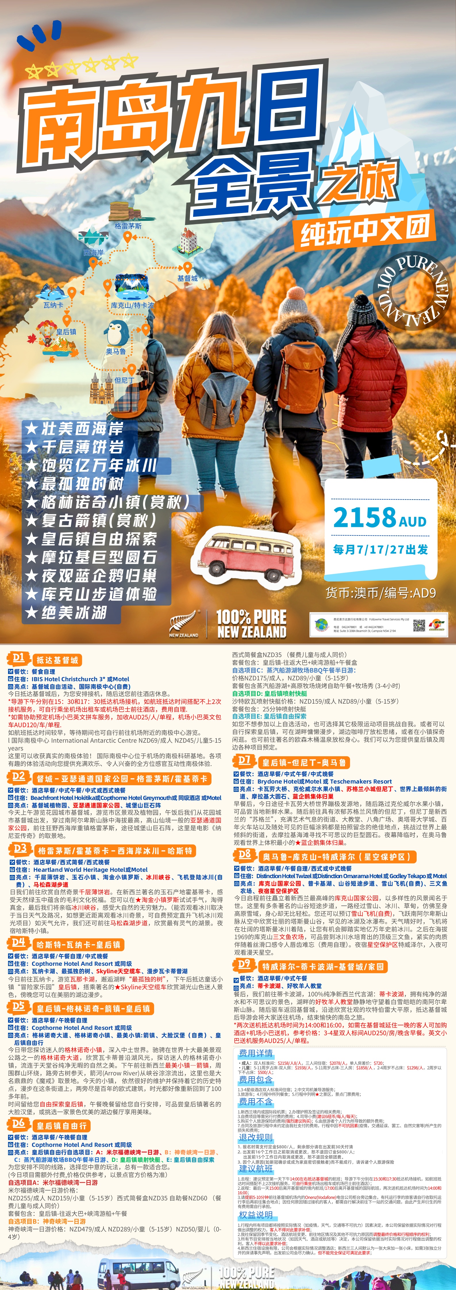 - 如需在基督城延住一晚的客人可加购酒店+机场小巴送机:参考价格: 3-4星双人标间AUD250/房/晚含早餐。