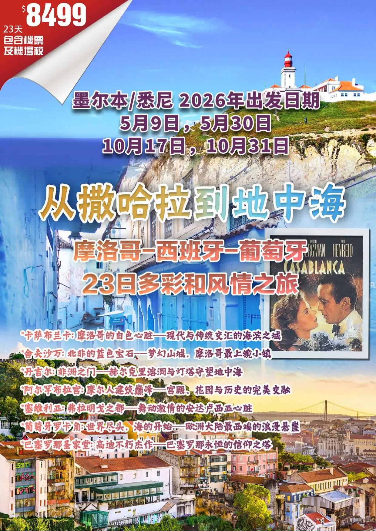 - 机票: 墨尔本/悉尼——巴塞罗那,卡萨布兰卡——悉尼/墨尔本来回经济舱机票和机场税(布里斯班/阿德莱德出发需付机票附加费用400.00澳元/人)