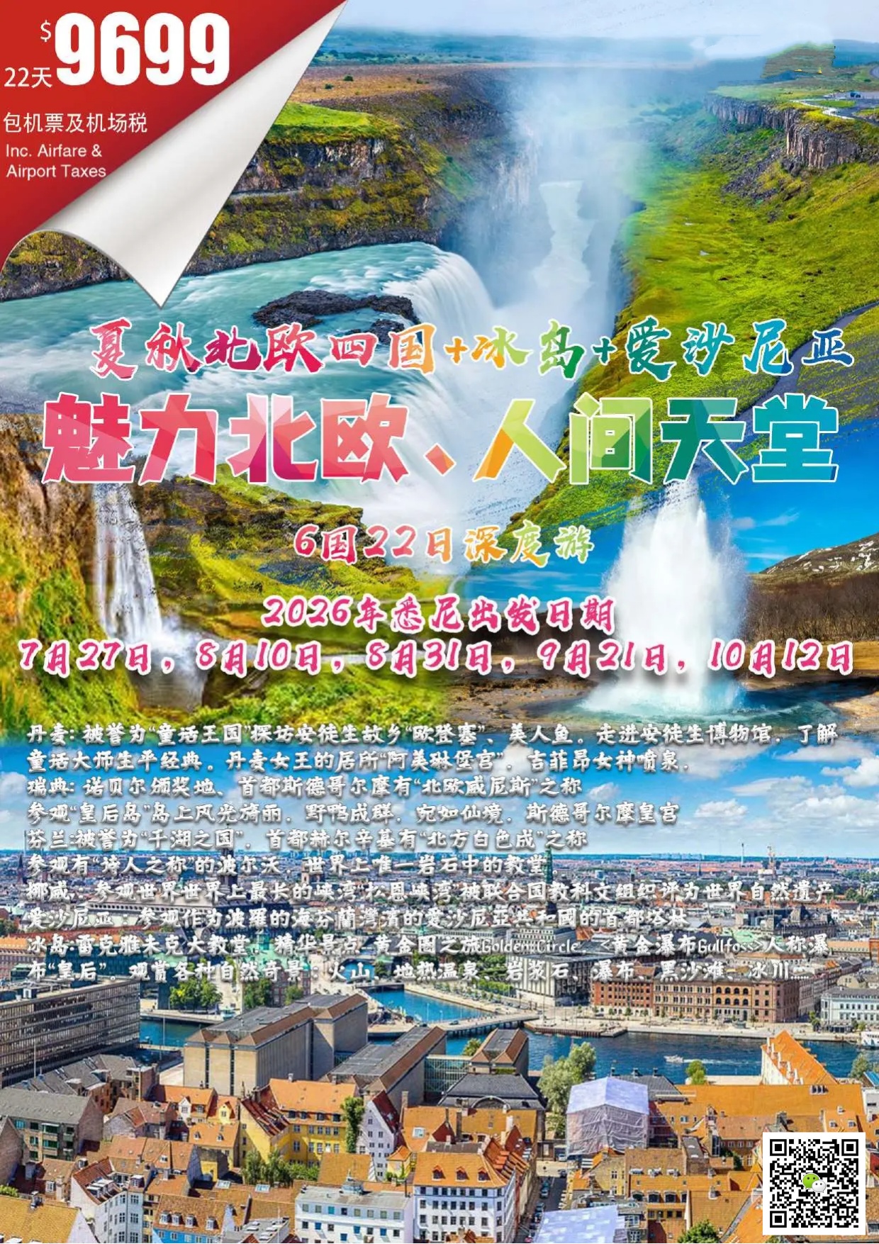 - 当地参团 Land Only (不含悉尼-赫尔辛基-悉尼国际段机票,含卑尔根-雷克雅未克-哥本哈根机票) $8599