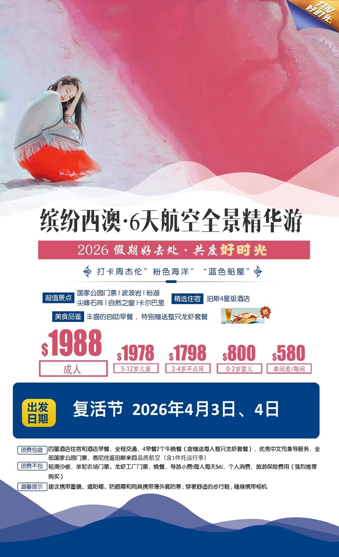 ✔费用包含:四星酒店住宿和酒店早餐、全程交通、4早餐+2个午晚餐(含赠送每人整只龙虾套餐)、优秀中文司兼导服务、全部国家公园门票,悉尼往返珀斯来回VIRGIN航空(含23KG的托运行李)