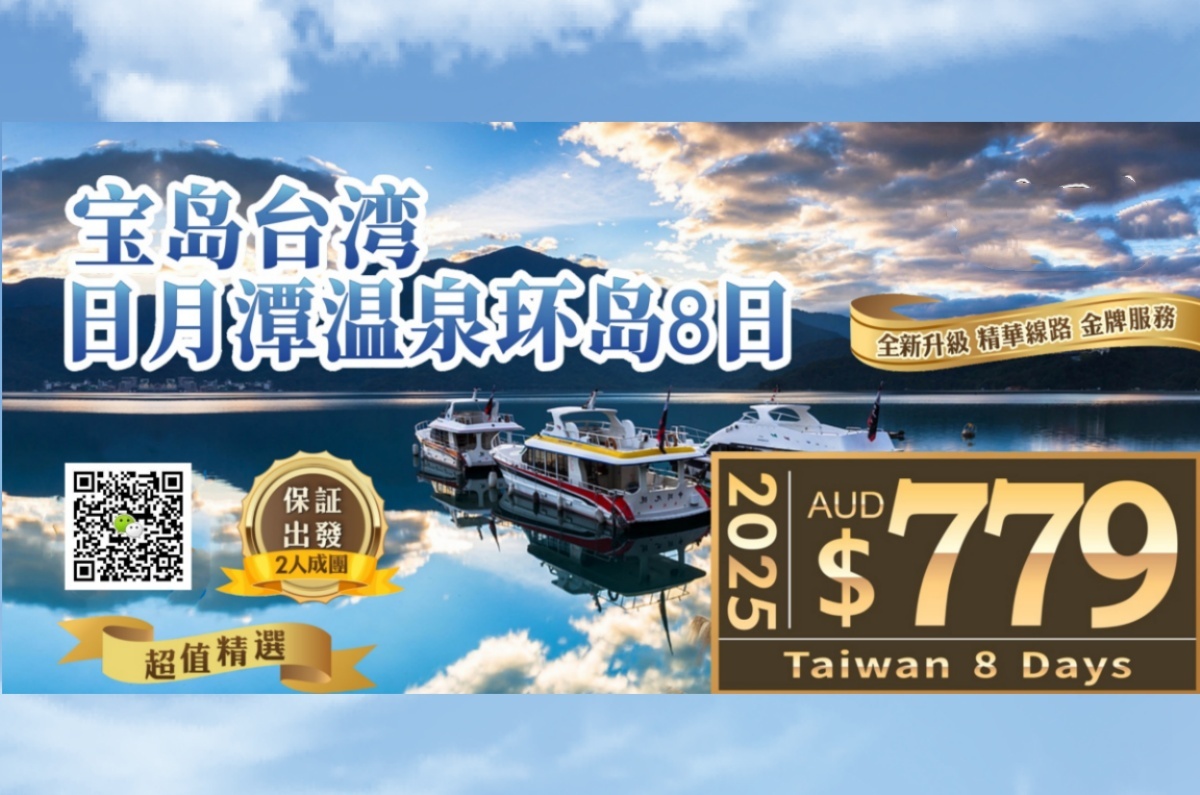 - 指定自费(大小同價,报名时预付,需保证参加) Compulsory program: 故宫博物馆+日月潭乘船游湖+北回归线纪念碑+曼波海洋生态休闲园区+花莲-苏澳新火车= A$240