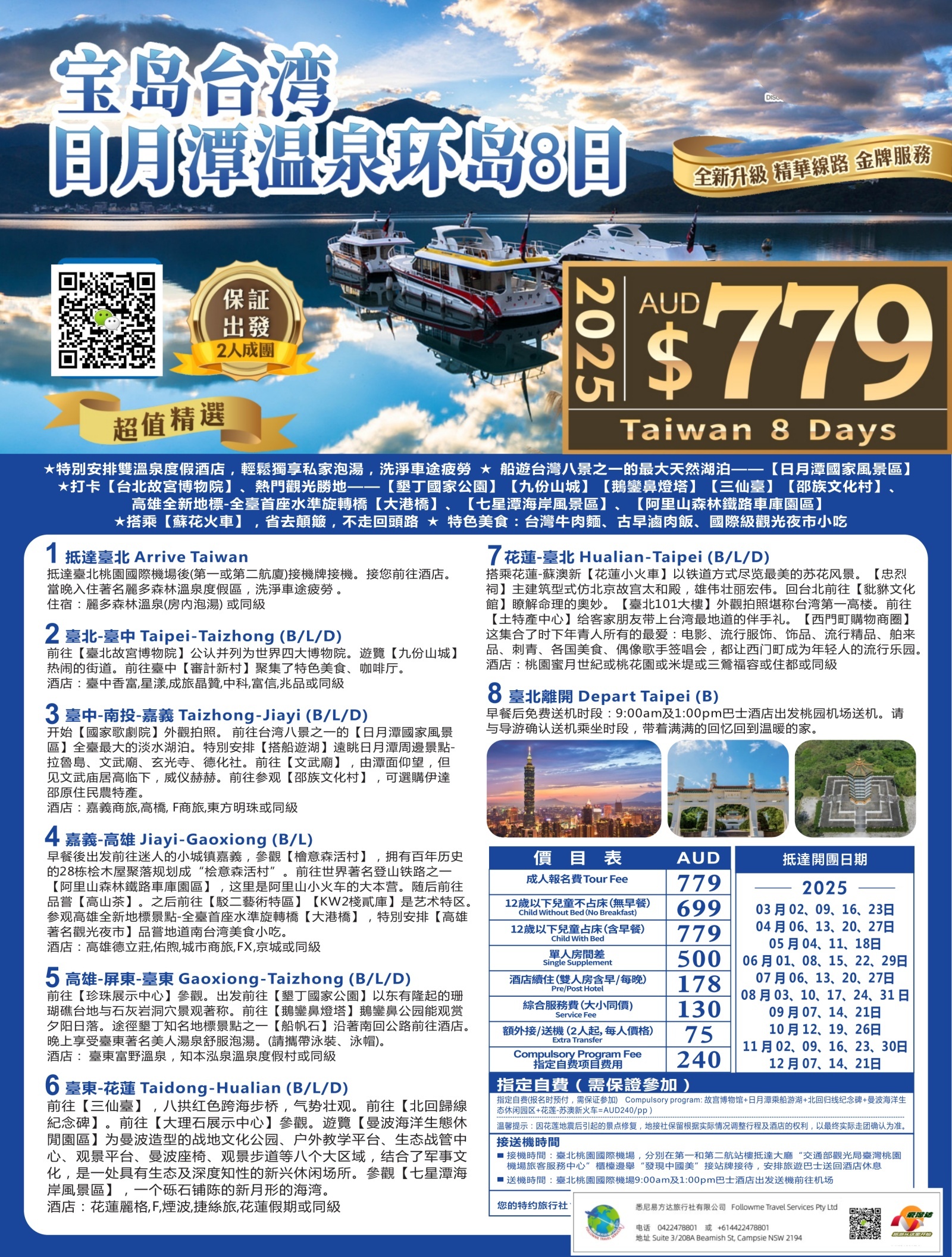- 指定自费(大小同價,报名时预付,需保证参加) Compulsory program: 故宫博物馆+日月潭乘船游湖+北回归线纪念碑+曼波海洋生态休闲园区+花莲-苏澳新火车= A$240