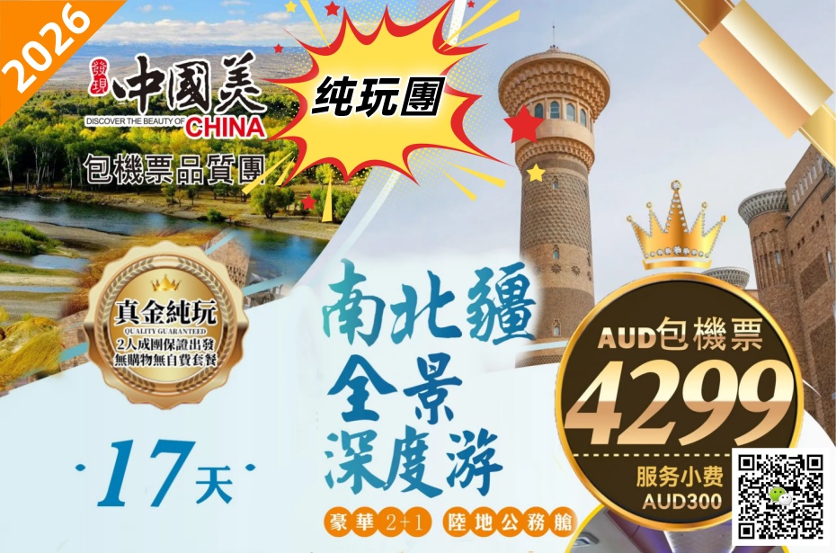 2026-09-04 中国 ○ 17天 新疆•南北疆全景深度游(纯玩團 澳洲出发含機票)