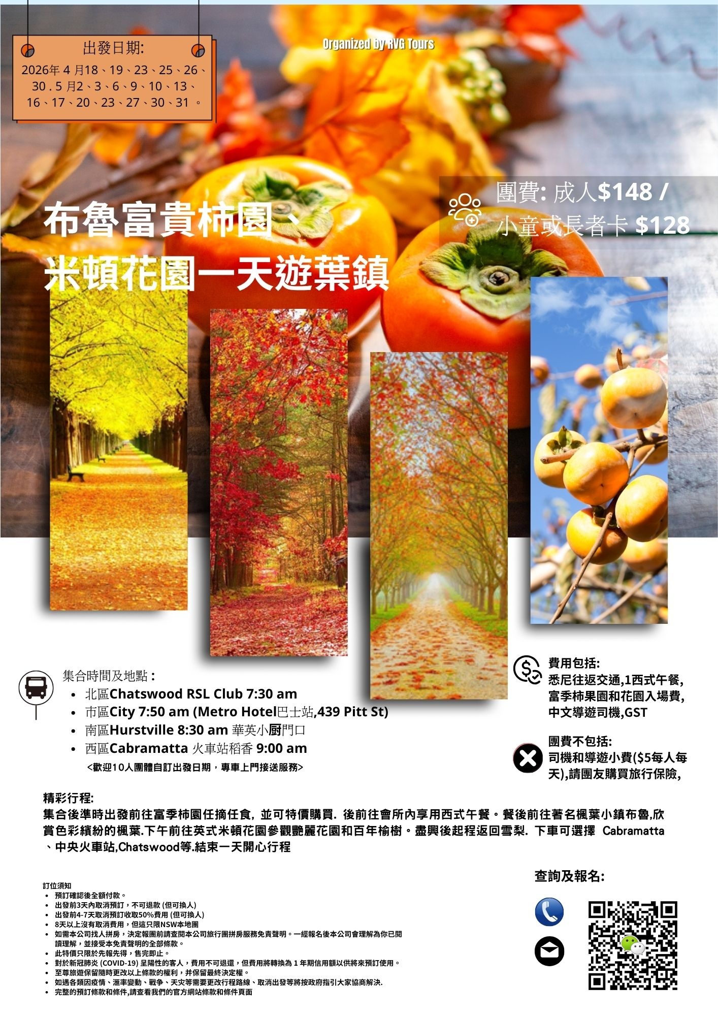 ✔費用包括: 悉尼往返交通、1西式午餐、富季柿果園和花園入場費、中文導遊司機