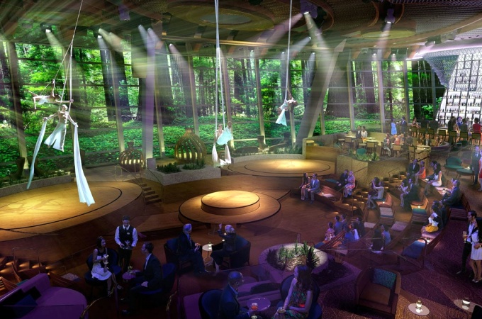 这是一个能带您去到世界上任何地方的多媒体剧院,在这里尖端的技术可以在您的眼前将两层楼高的窗户旋转270°。前一分钟您还沉浸于奇妙的海景里,下一分钟您又沉浸于世界上的其他地方或是您从未见过的场景。当夜幕降临,空间转换开始后,机器屏幕和空中表演者将会把这里变成一个奇妙的世界。