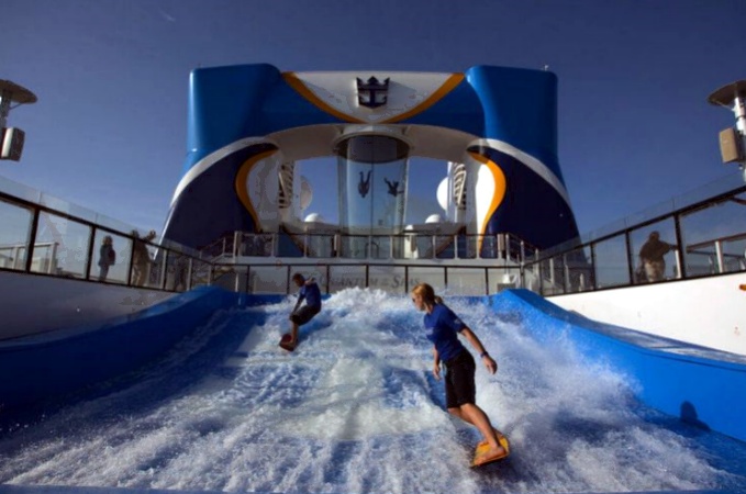 甲板冲浪是的冲浪模拟器,约40英尺长,每分钟提供3万加仑(一个标准泳池的水量),让你在邮轮上乘风破浪。